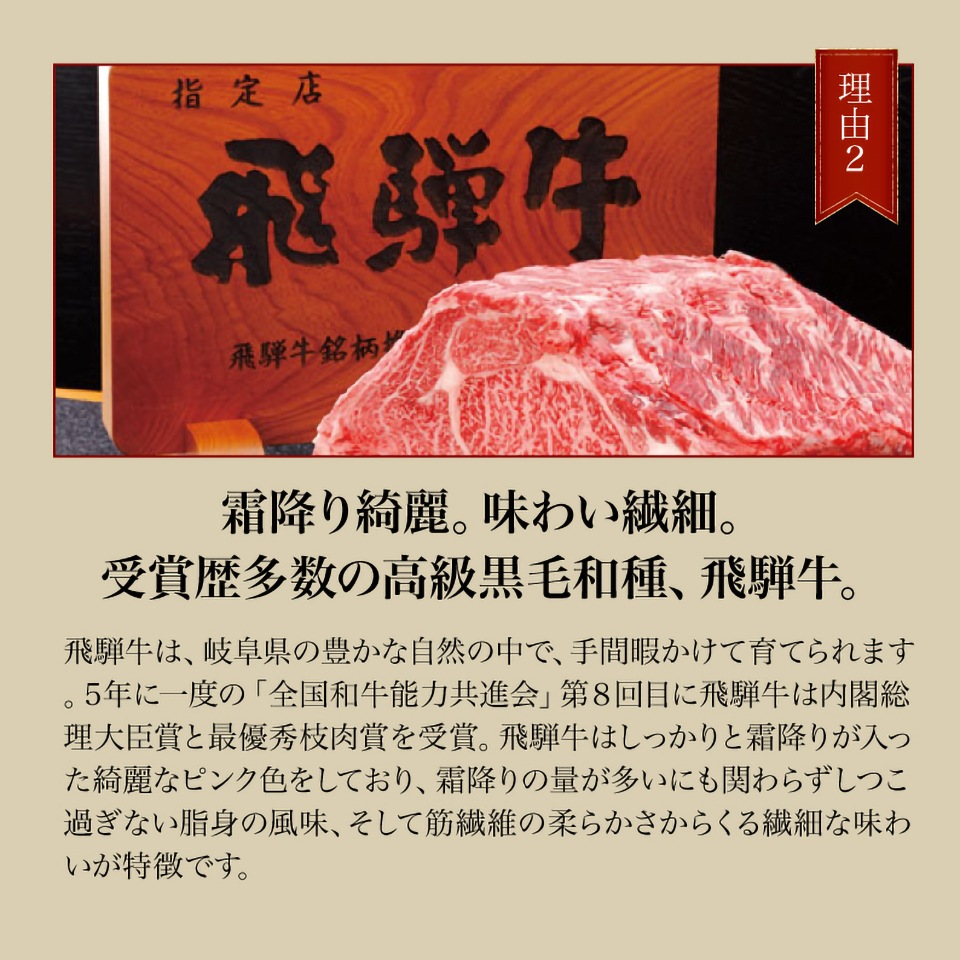 飛騨牛は、岐阜県の豊かな自然の中で、手間暇かけて育てられます。5年に一度の「全国和牛能力共進会」第8回目に飛騨牛は内閣総理大臣賞と最優秀枝肉賞を受賞。飛騨牛はしっかりと霜降りが入った綺麗なピンク色をしており、霜降りの量が多いにも関わらずしつこ過ぎない脂身の風味、そして筋繊維の柔らかさからくる繊細な味わいが特徴です。