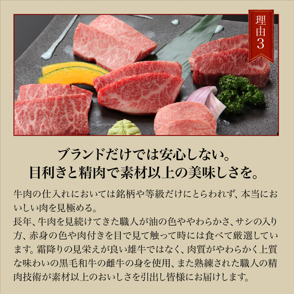 長年、牛肉を見続けてきた職人が脂の色ややわらかさ、サシの入り方、赤身の色や肉付きを目で見て触って時には食べて厳選しています。霜降りの見栄えが良い雄牛ではなく、肉質がやわらかく上質な味わいの黒毛和牛の雌牛の身を使用、また熟練された職人の精肉技術が素材以上のおいしさを引出し皆様にお届けします。